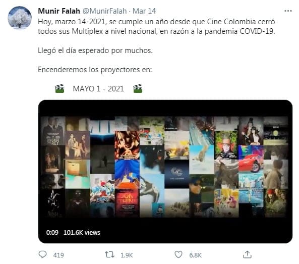 “Hace un año exactamente, el 14 de marzo de 2020, las salas de Cine Colombia cerraron sus puertas debido a la pandemia del Covid19.