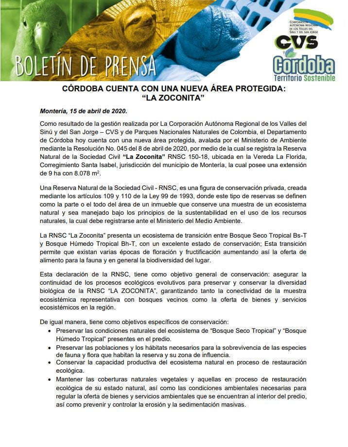 Se trata de la Reserva Natural de la Sociedad Civil «La Zoconita» (RSC), ubicada en la vereda La Florida, corregimiento Santa Isabel, de Montería.
