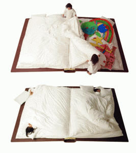 Este formato permite que el mueble como si de un libro se tratase pueda abrirse por la noche y dejar a los habitantes de la casa dormir entre las sábanas con forma de almohada.