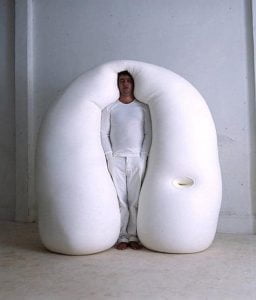 Un cojín gigante colocado verticalmente envuelve el cuerpo del dormilón mientras él se mantiene de pie. Su creador Ernesto Neto creó una cómoda y curiosa cama para aquellos a los que les guste dormir entre almohadones.