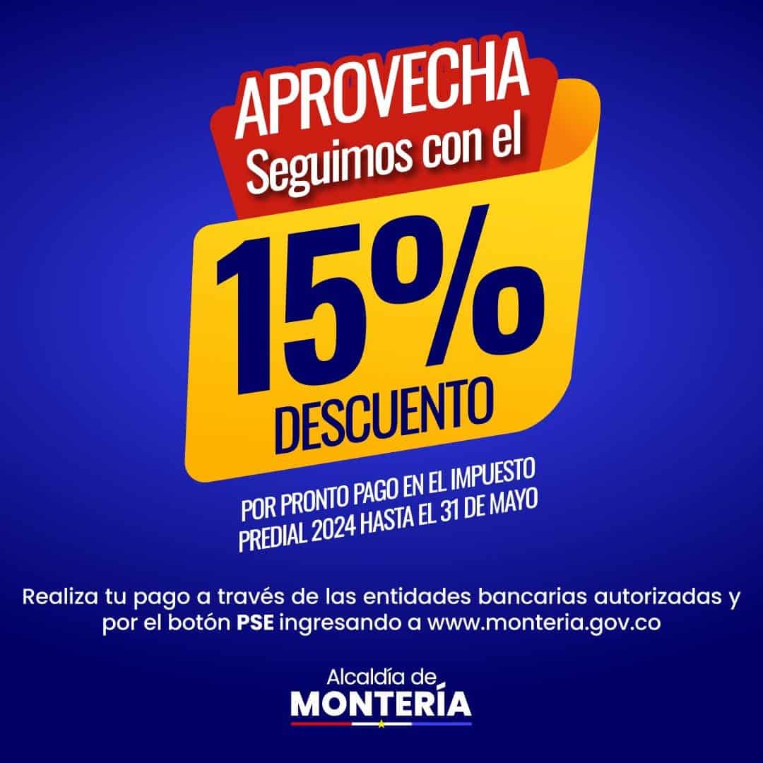 La secretaria de Hacienda de Montería, Lupita Bello Tous, ha reiterado que el descuento del 15% en el Impuesto Predial Unificado para el año 2024 seguirá vigente durante todo el mes de mayo.