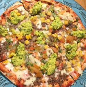 Pizza crocante, salsa napolitana con un toque sutil de vino blanco, queso mozzarella, carne molida, pico de gallo, guacamole, maíz tierno y crema agria tres pimientas.