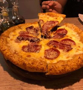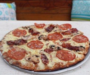 Pizza artesanal palmoteada a mano con queso mozarella, pepperoni, tocineta al horno, queso parmesano.