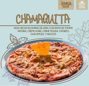Pizza personal, hecha en horno de leña con pasta de tomate natural, crema agria, carne molida, chorizo, guacamole y nachos.