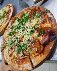 masa leudada por 2 días acompañada de base de tomates pelattis, pollo salteados con salsa BBQ de la casa, Laminas de cebolla morada marinadas con limon y un toque de Cilantro fresco picado