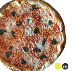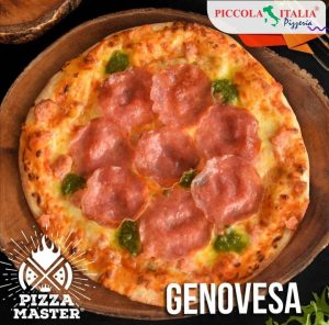 Masa artesanal, salsa sorrentina, queso mozzarella, salchicha italiana, salami genovés y pesto.